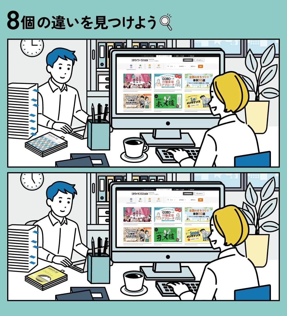 ちょっと一息、頭の体操。2枚のイラストを見比べて、8つのまちがいを探してみませんか?通勤の合間や休憩時間に、気軽に楽しめる「まちがいさがし」をお届けします。