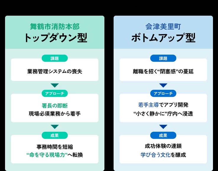 トップダウン型で進めた舞鶴市消防本部と、ボトムアップ型で進めた会津美里町。進め方は違っても、根底にある“人の意識を変えよう”という思想は共通している。また、両事例を見ると、DXの成果は単なる業務の効率化にとどまらないことが分かる。