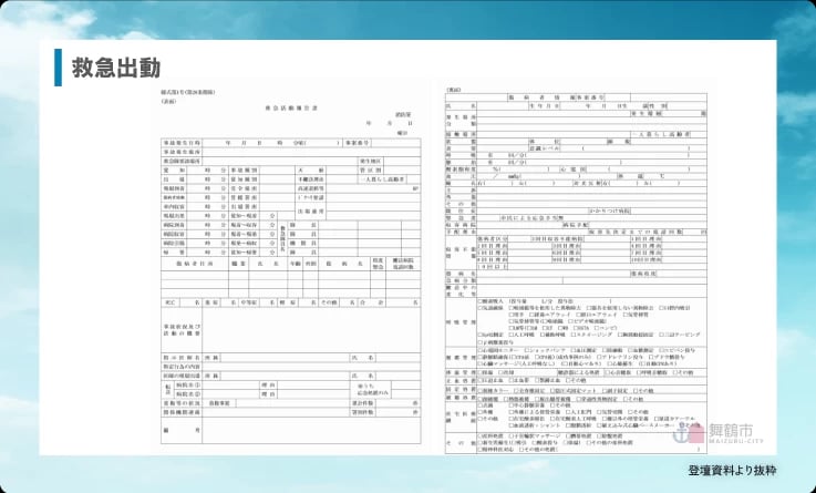 舞鶴市消防本部では、市民の生命、身体および財産を災害から守るため、日々訓練を行っています。「災害がないときや訓練時以外は何をしているのか」と聞かれることがありますが、実は膨大な事務作業があるんです。主に報告書の作成などで、傷病者の情報や、バイタルサイン、救急隊の活動内容などを細かく記録しなくてはなりません。救急車の走行記録も必要です。火災でも、救急出動でも、予防検査でもこうした事務作業が発生します。