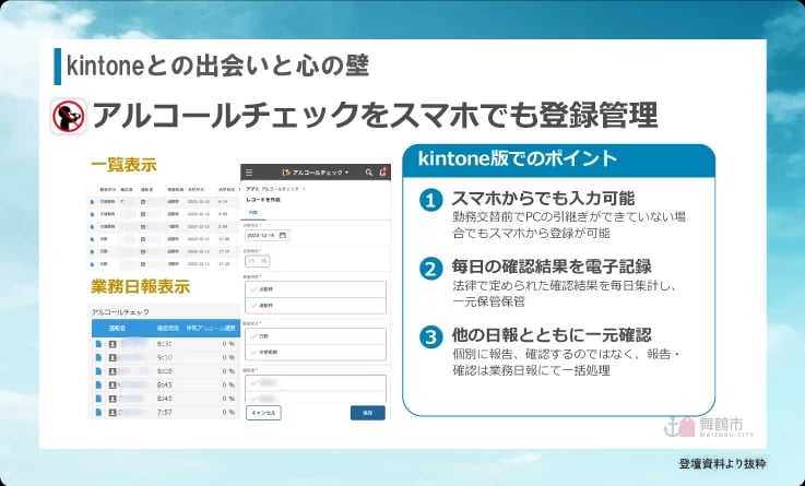 消防本部では、出勤したらまずアルコール測定をして、パソコンを開いてデータベースにログインし、数値を入力して上司に報告する、というフローでアルコールチェックを行っていました。手数が多いので、ミスや入力忘れも起きていたのですが、大事なことなので毎日実施しないといけません。そこに目を付けたのです。