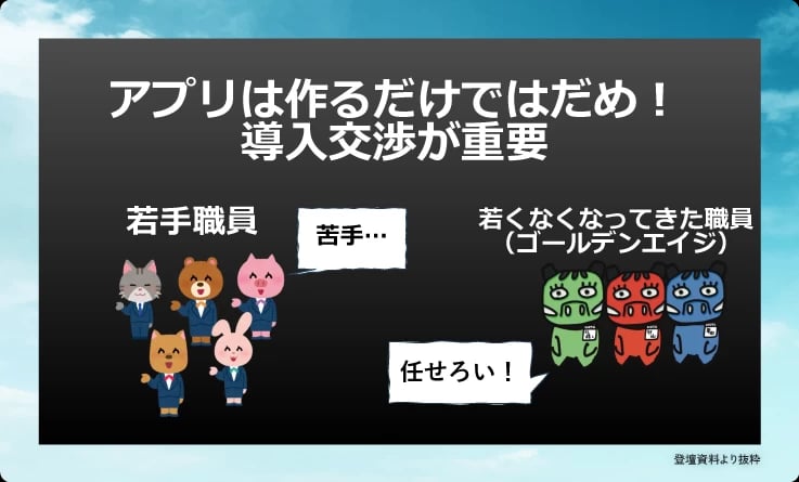 また、アプリはつくるだけではダメで、現場への導入交渉が活用へのカギになります。