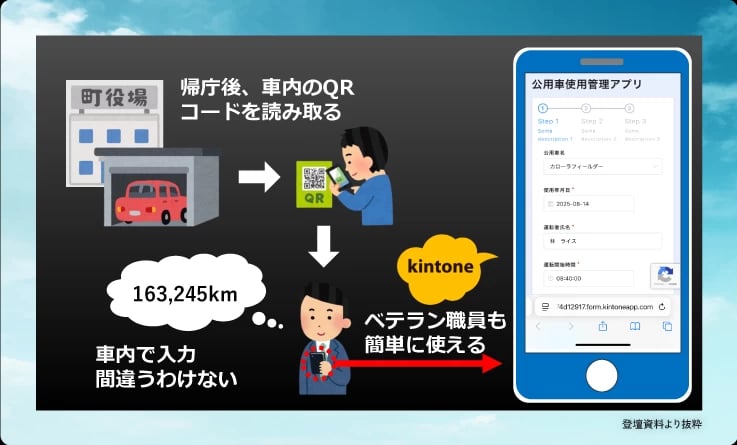 このような流れで、ラボのメンバーはどんどんアプリをつくっていきました。そして1本目のアプリを導入することになります。広く使ってもらうためには、全職員が関わるもので、便利だと感じやすいものを選ぶのが一番。そこで選んだのが「公用車運転日報」です。