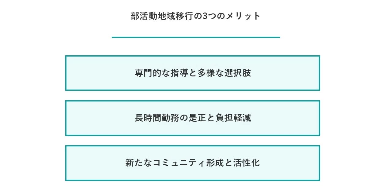 生徒にとって最大のメリットは、より専門的な指導を受けられる機会が増えることである。学校の教員は必ずしもその競技や分野の専門家ではなかったが、地域クラブでは専門的な知識やスキルをもつ指導者による質の高い指導が期待できる。