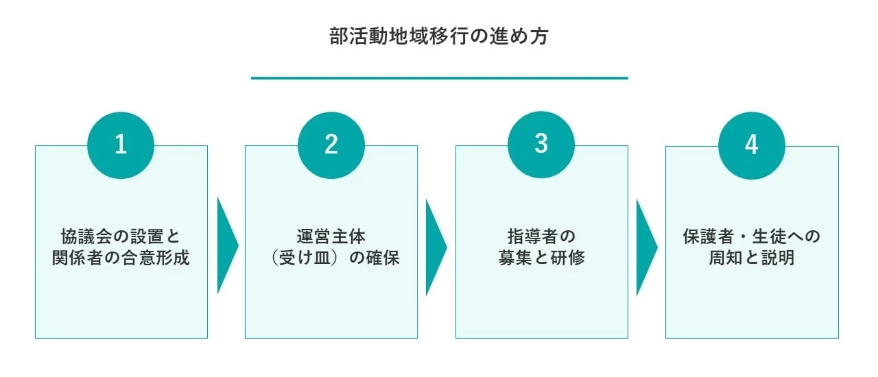 部活動の地域移行を円滑に進めるためには、関係者が連携し、計画的にステップを踏むことが重要である。ここでは、多くの自治体で採用されている一般的な進め方の手順を解説する。