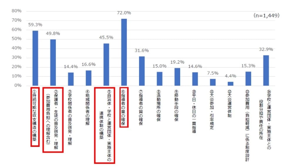 これまで公教育の一環として比較的安価に参加できた部活動が、地域クラブ化することで月謝などの費用が発生し、保護者の経済的負担が増加する可能性がある。また、活動場所が学校外や遠隔地になることで、保護者による送迎が必要となるケースも増えると考えられる。