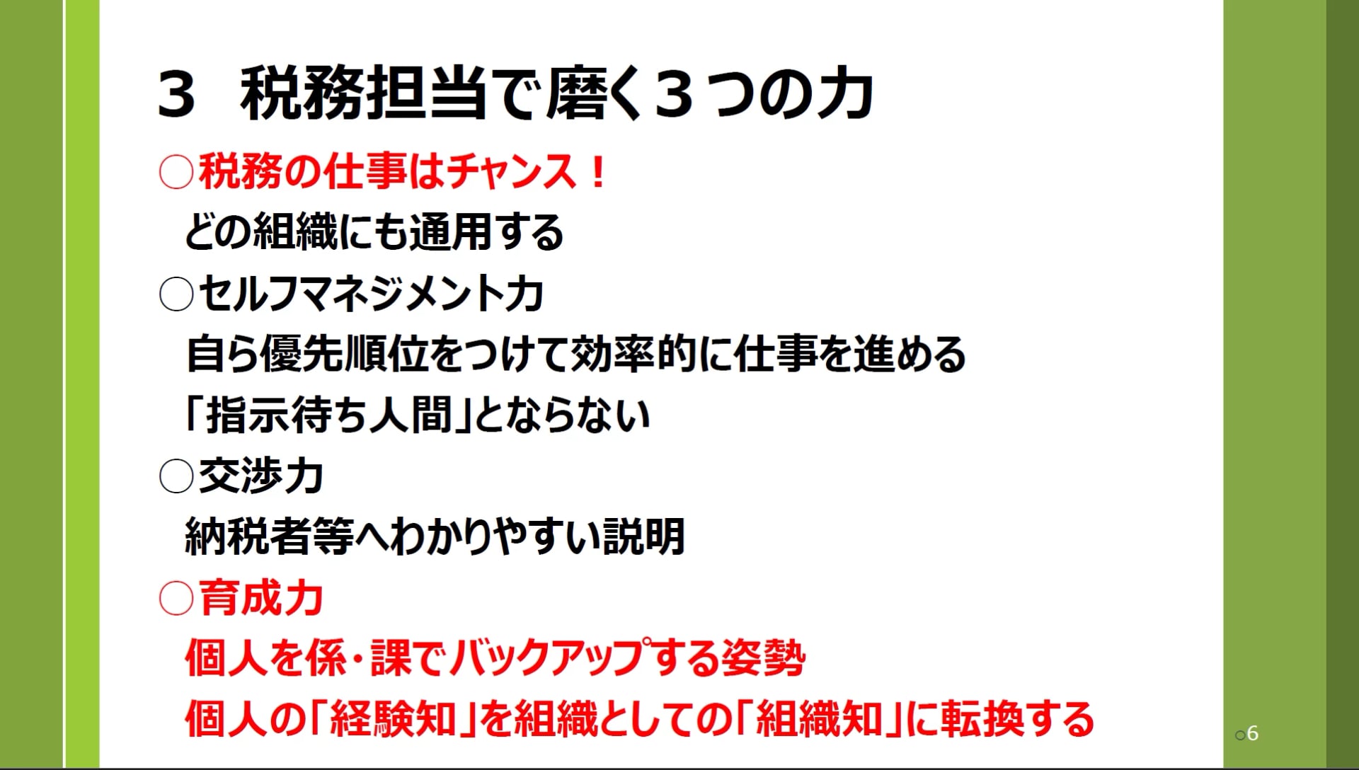 公務員は異動が当たり前です。今税務を担当している方は、数年後には福祉や建設など、全く別の現場に行くこともあるかもしれません。しかし、税務の現場で身についた知識はどこにいっても通用するはずです。そのためにも、ぜひ3つの力を磨きましょう。