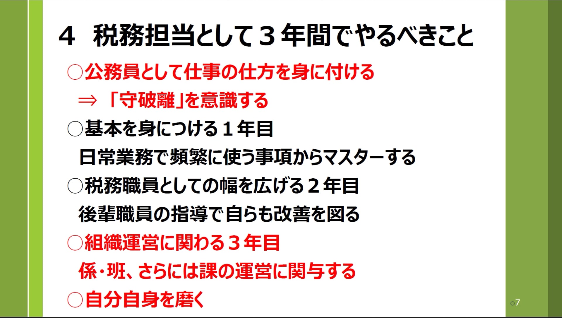 この「守破離」を、1年目、2年目、3年目にあてはめて考えてみましょう。1年目は「守」で、日常業務で頻繁に使う知識などの基本をしっかり身につけます。2年目「破」は、税務職員として視野と幅を広げる時期。後輩を指導する機会も出てくるので、指導を通じて自分自身も改善できます。3年目「離」は、いよいよ組織運営にも関与する段階。係や班、さらには課の運営に対しても自分の意見を持ち、積極的に関わってください。