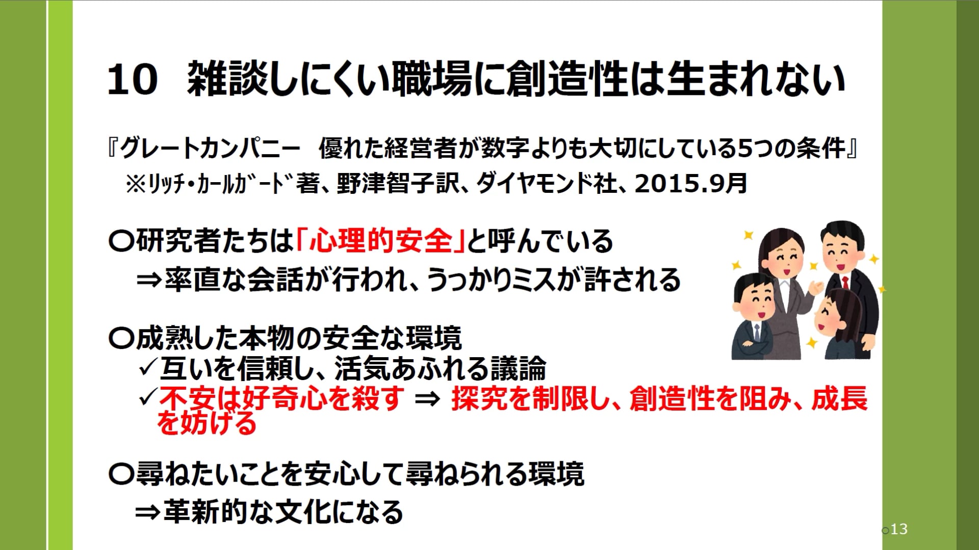 失敗を財産としてとらえるには心理的安全性が保たれていることも大切です。管理職だけではなく、職員一人ひとりが安全な環境を意識しましょう。