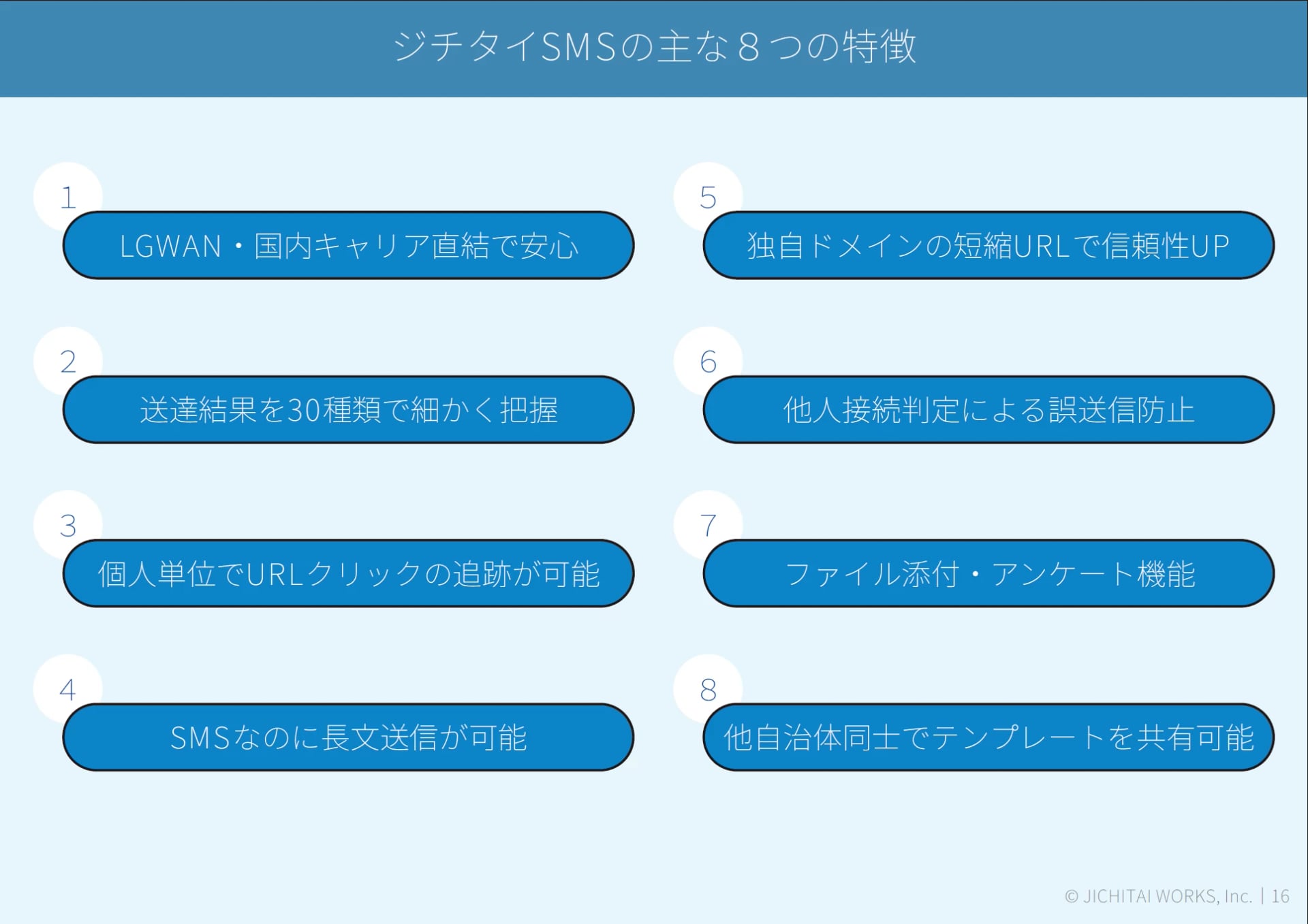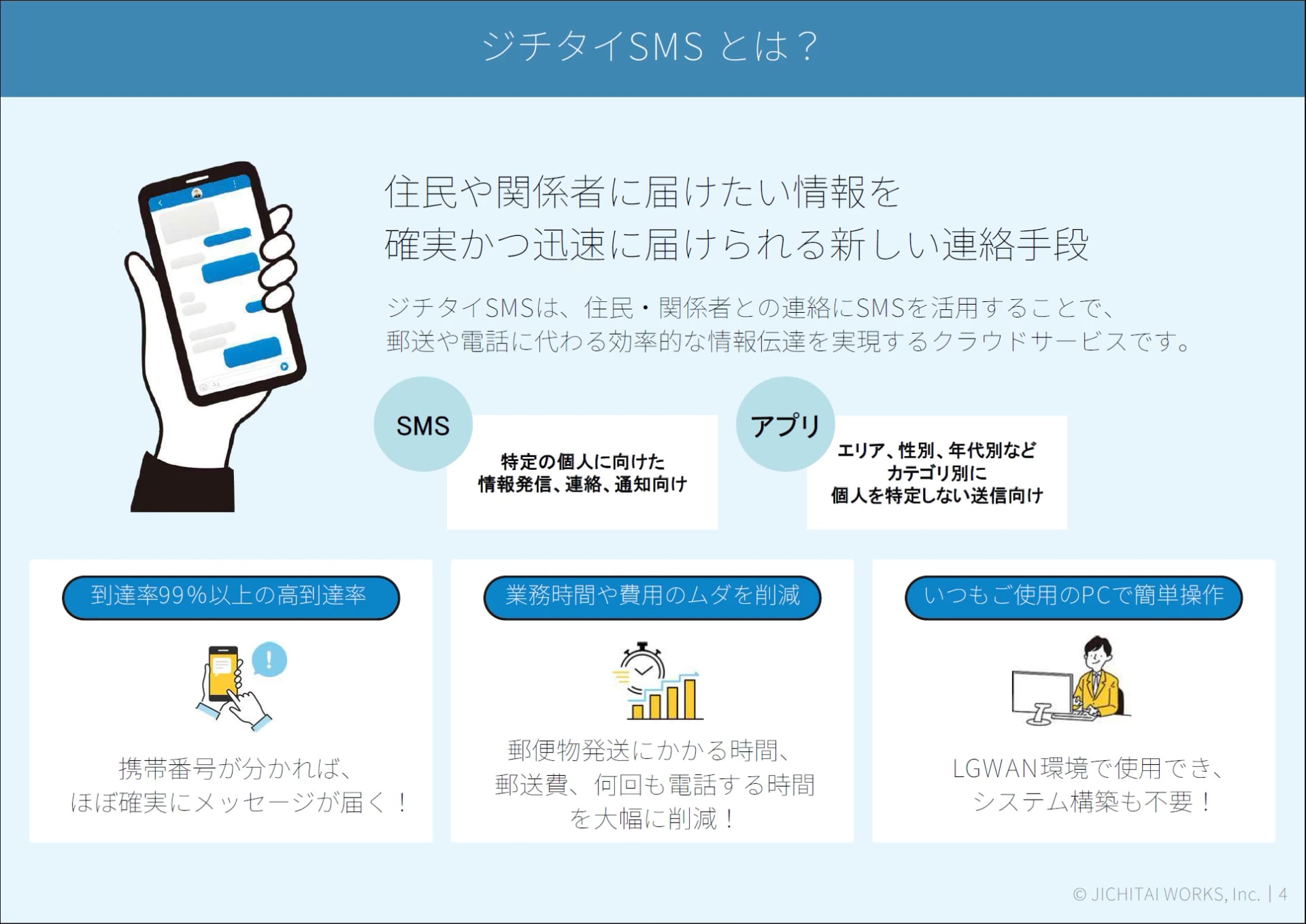 「ジチタイSMS」のポイントは3つ。1つ目は、到達率が99%以上。2つ目は、手間がかからない・コストを抑えられるという点です。3つ目は、普段お使いのパソコンから簡単に操作できるということ。LGWANにも対応していますので、セキュリティ面も安心です。