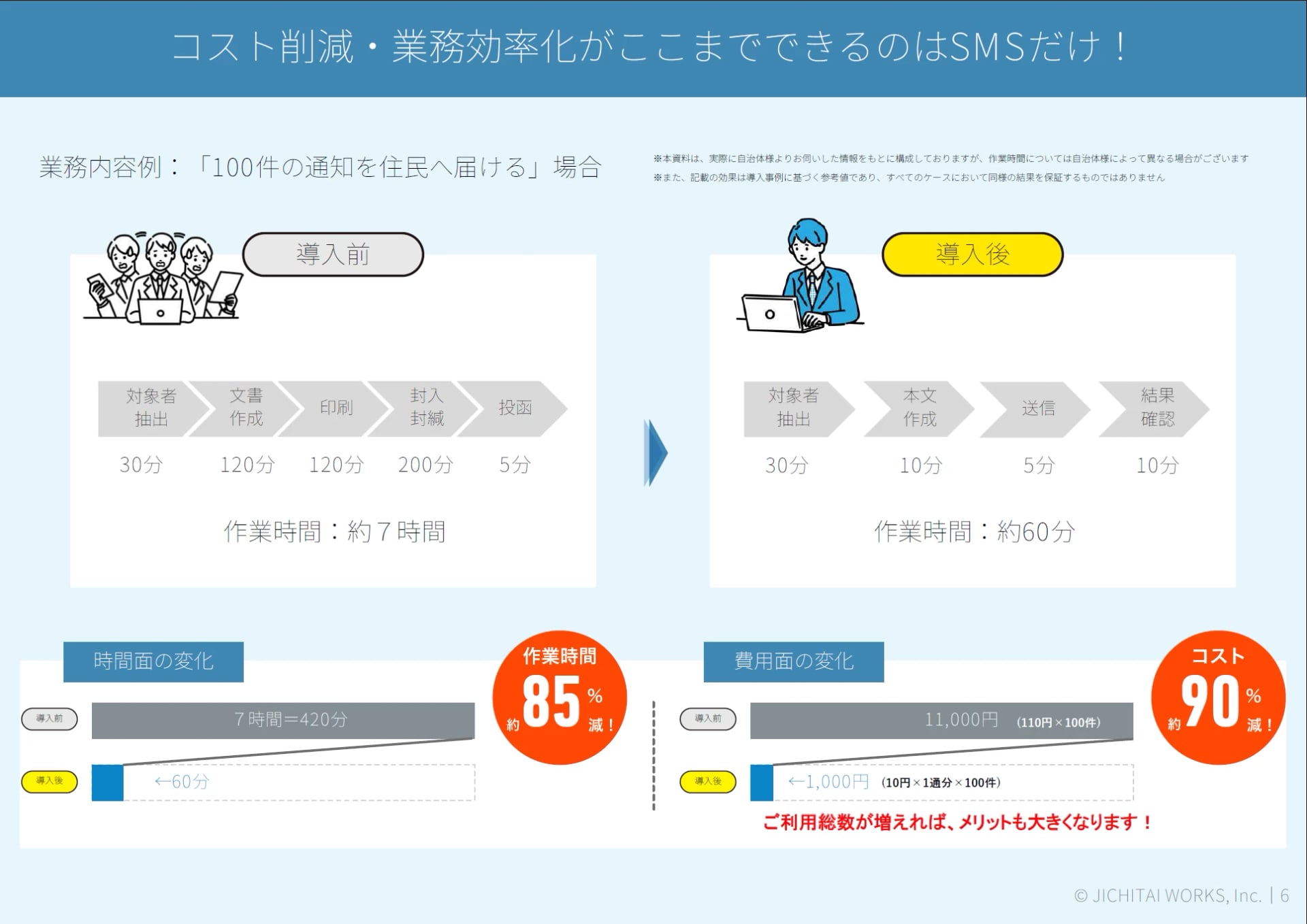 「100件の通知を住民へ届ける」場合、これまでは全てが手作業で作業に約7時間かかっていました。ところが、SMS導入後は作業工程が減り、1時間で完了するようになっています。さらに、費用に関しては90%の削減が見込めます。