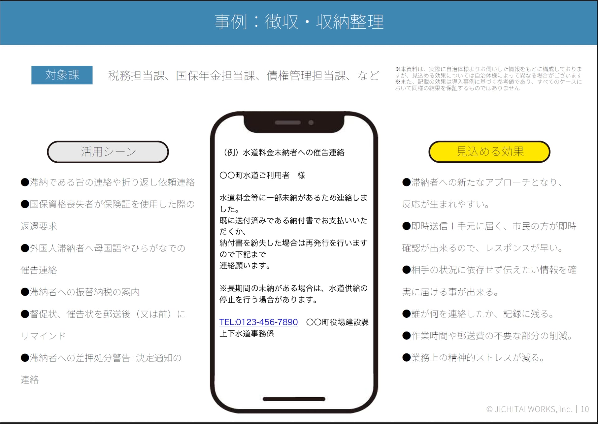 どの部署でも活用できる点も、ジチタイSMSの魅力です。徴収や滞納整理にも活用シーンはさまざまあると考えられます。例えば、滞納者の方への連絡。何度も電話してもつながらなかったり留守電にも切り替えられなかったりする場合、SMSとして送ることができるのは非常に便利です。また、テキストでのやりとりなので外国人の方ともコミュニケーションが取りやすいと考えられます。