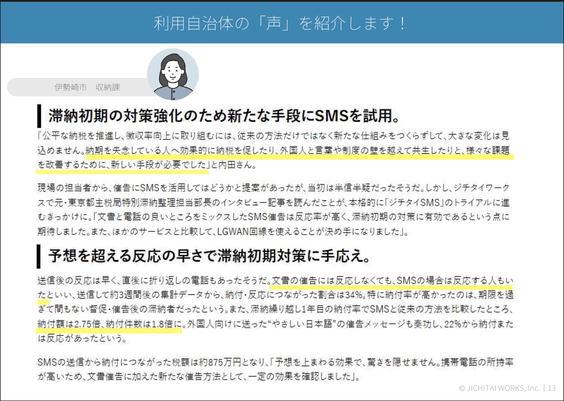 以下は、ジチタイSMSを導入した伊勢崎市の職員の方からのメッセージです。こうしたリアルなお声はジチタイワークスWEBでも取り上げているので、ぜひご覧ください。