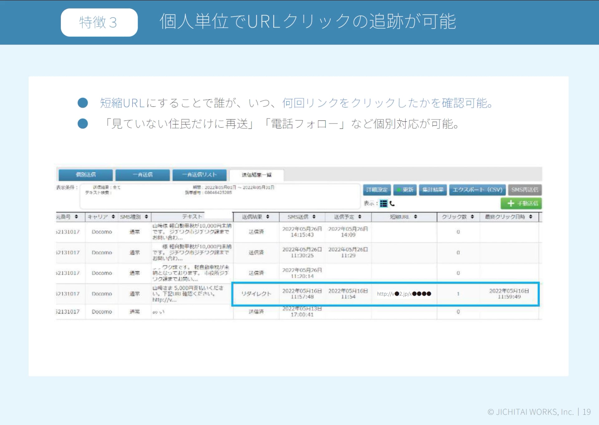 SMSはURLも送れます。また、送った後にはそのURLがクリックされたかどうかをシステム上で確認することも可能です。つまり「送って終わり」ではなく、「誰がいつ見たか」「どのくらい見てもらえているか」まで把握できるので、その後のフォローもしっかりできる、というのが大きな特徴です。