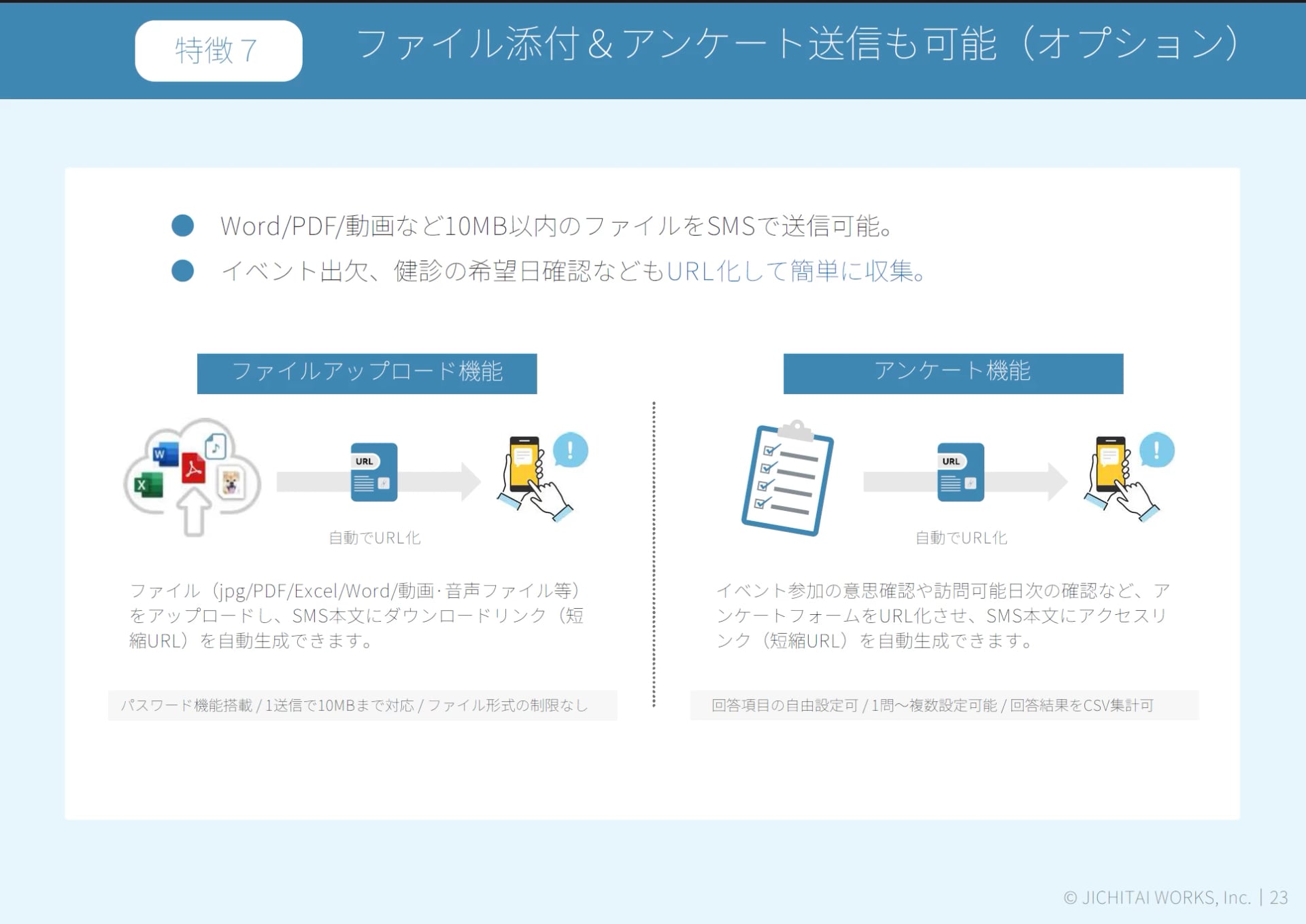 JPEGやPDF、Excelなど、ファイル添付が可能です。そのため、今まで郵送していた申請書類もSMSで送信できます。また、他社のアンケートサービスを導入されているようであれば、そのURLをメッセージに貼り付けて送ることも可能です。