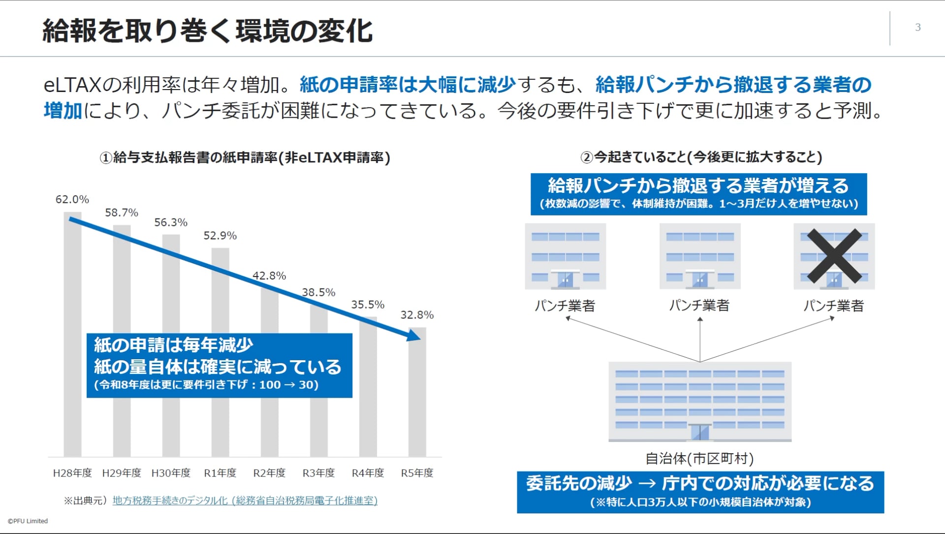さらに状況はこれから加速します。来年度、正確には再来年度にかけて、eLTAXの要件がまた引き下げられ、30万以上・30人以上の事業者は電子申請が必須になります。これにより、紙はさらに減ります。つまり、パンチ業者さんの撤退は今後さらに加速するだろうと考えられるのです。