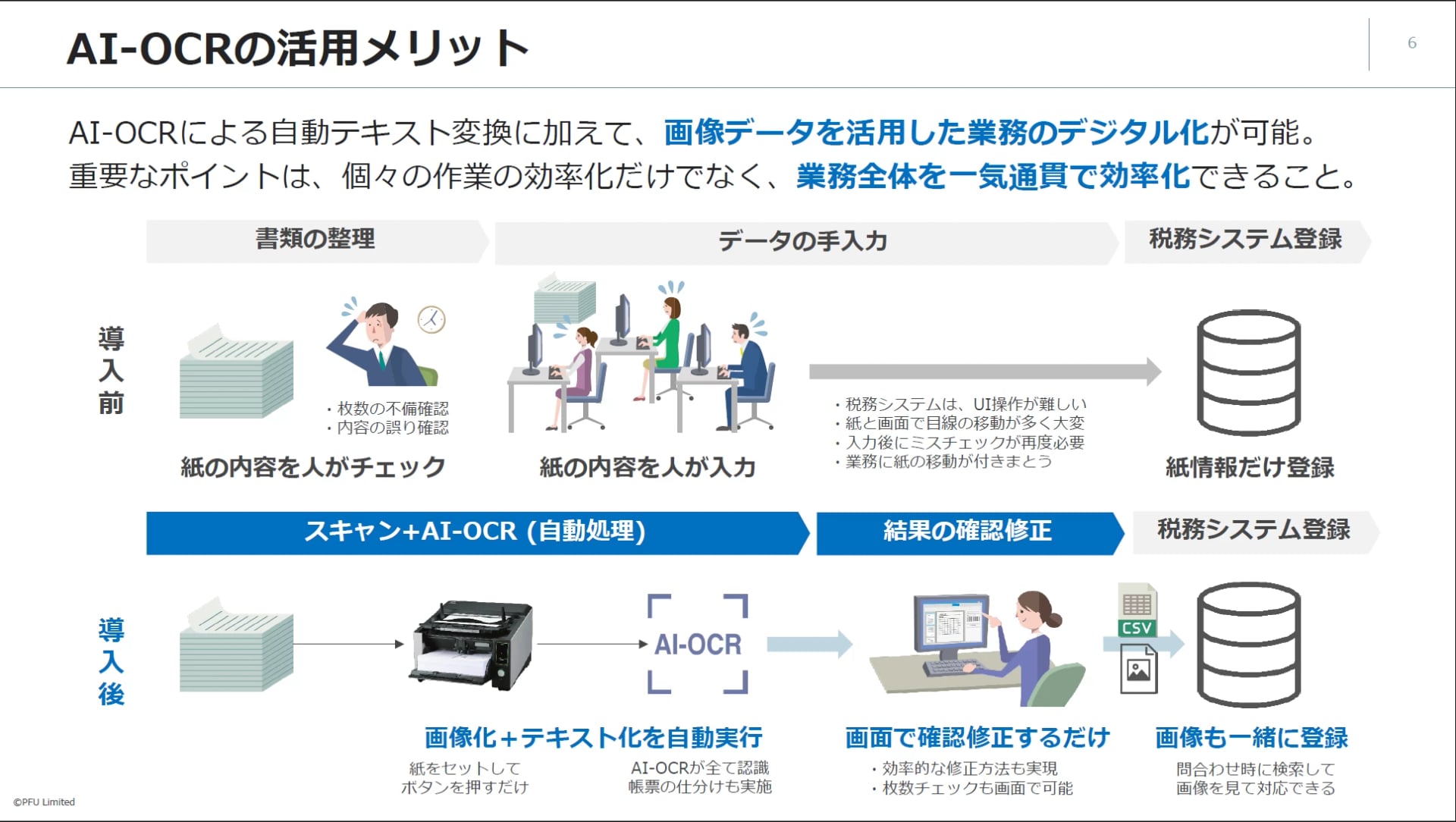 AI-OCRを活用する最大のポイントは、業務全体を一気通貫でデジタル化し、効率化できるという点です。導入前と導入後のフローを比較しながらご説明します。