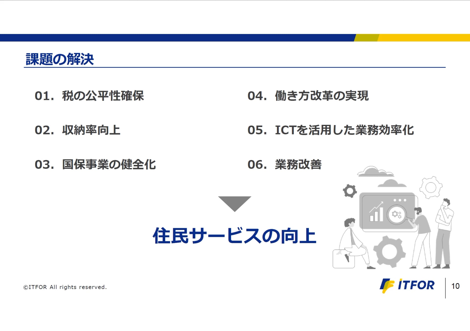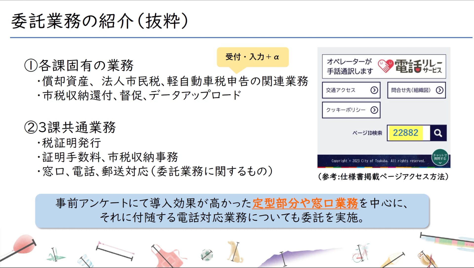 まとめますと、業務改善による市民サービスの向上、そして外注可能な業務を切り離すことで職員が市職員にしかできないコア業務へ注力できる環境をつくることがねらいです。その結果として、適正な課税と税負担の公平性をより高めていくことができると考えています。