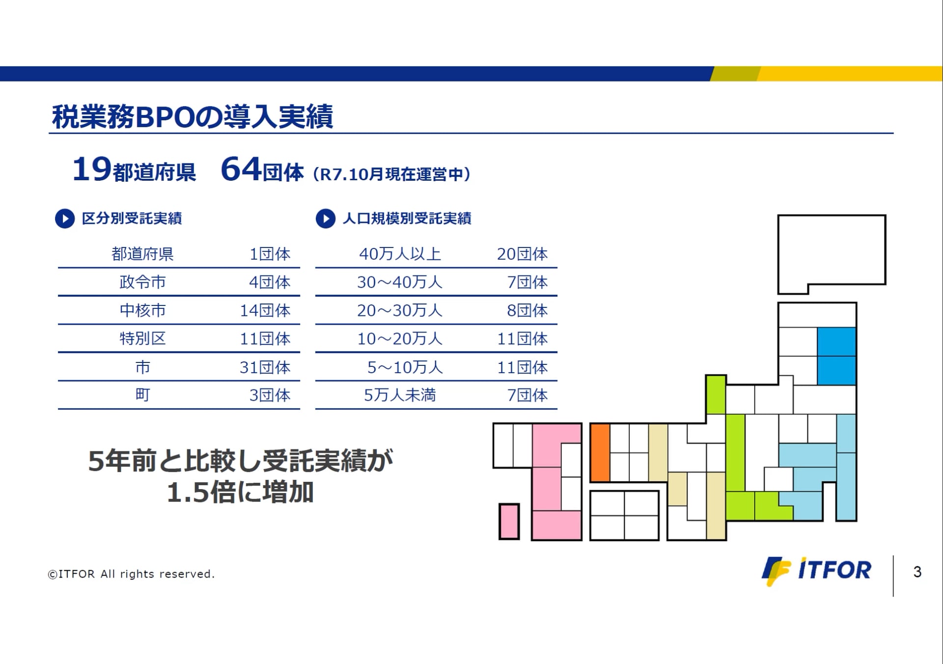 現在、税業務におけるBPO(民間委託事業)事業は全国64団体で稼働しており、5年前から約1.5倍に拡大しています。