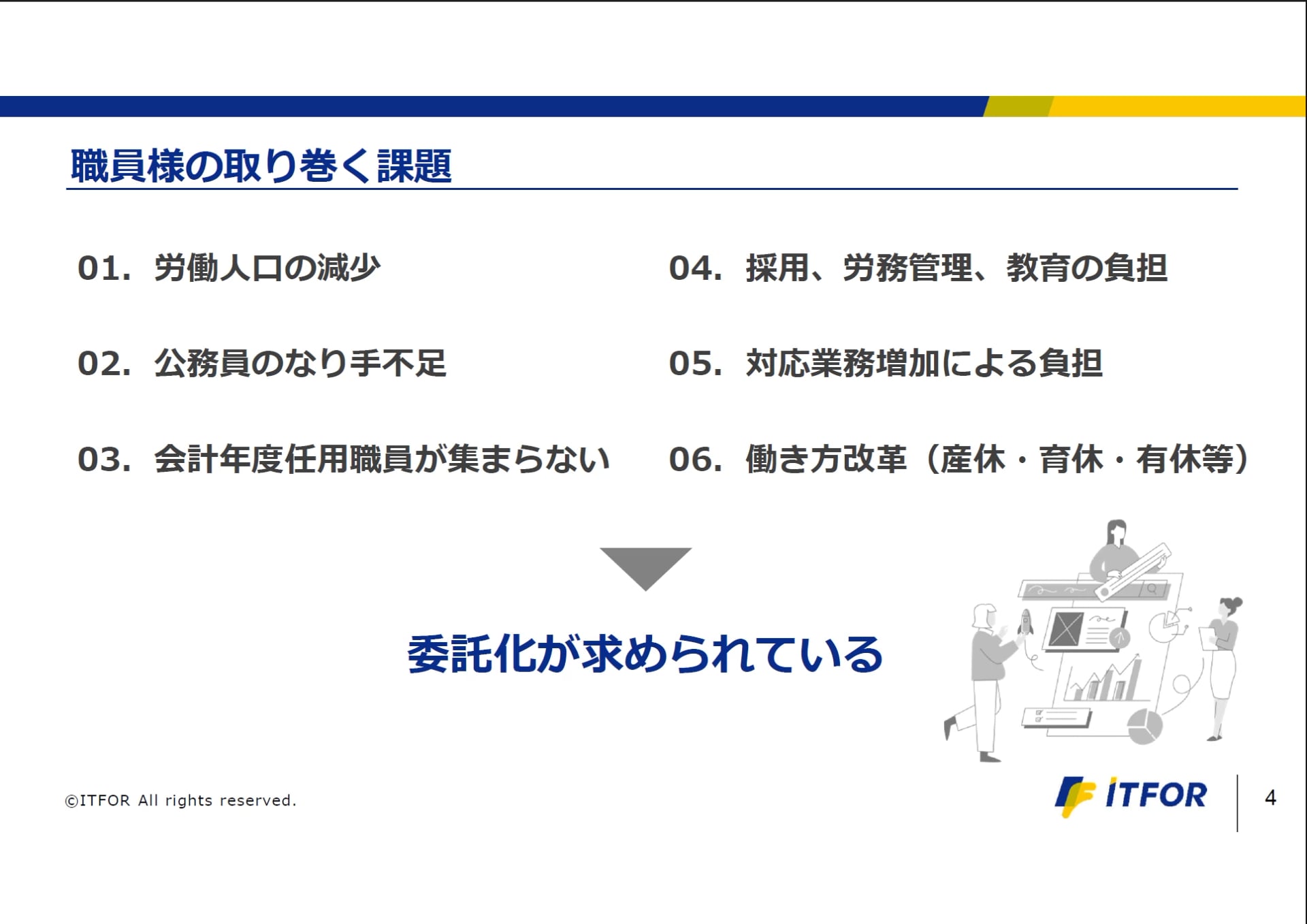 ここからは、弊社が進めているICT活用の取り組みを紹介します。弊社はもともと滞納管理システムを開発してきたIT企業であり、自治体業務のICT化は得意分野です。近年、自治体では職員数の減少が続き、従来の「人手で支える運用」から脱却する必要性が高まっています。そこで弊社は、業務をICTで再設計する提案を重視しています。