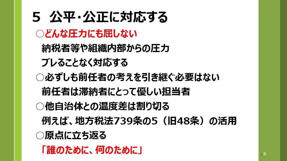 まず覚えていただきたいのは、皆さんは市町村民のため、市町村税確保のために仕事をしているということ。皆さんの仕事(財源確保)は黒子役であるということです。