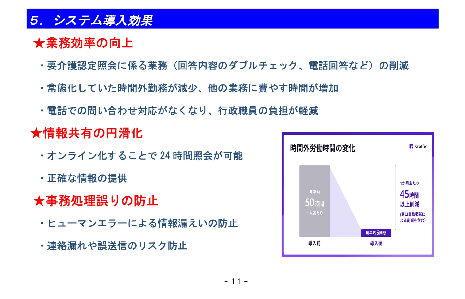 導入効果の中でも特に大きかったのが、職員の時間外勤務の削減です。これまでは職員1人あたり月50時間を超えていた残業時間が、現在では5時間もないほどに減りました。その結果、空いた時間を使って他の業務改善に取り組めるようになり、事務処理の質も向上しています。