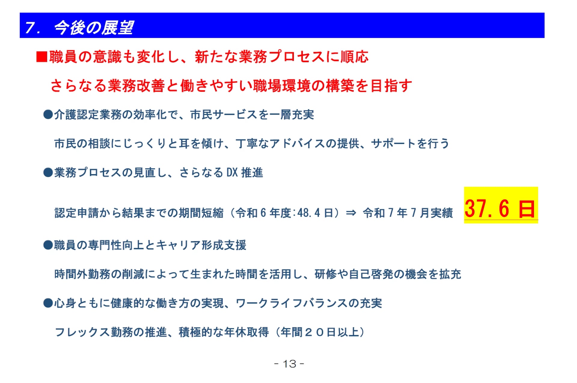 こうした取り組みの結果、認定申請から結果通知までの期間は大幅に短縮されました。令和6年度は48.4日でしたが、令和7年度途中には37.6日、先月は38.0日まで改善しました。今後はさらに1週間短縮することを目標に、職員全員で工夫を重ねています。