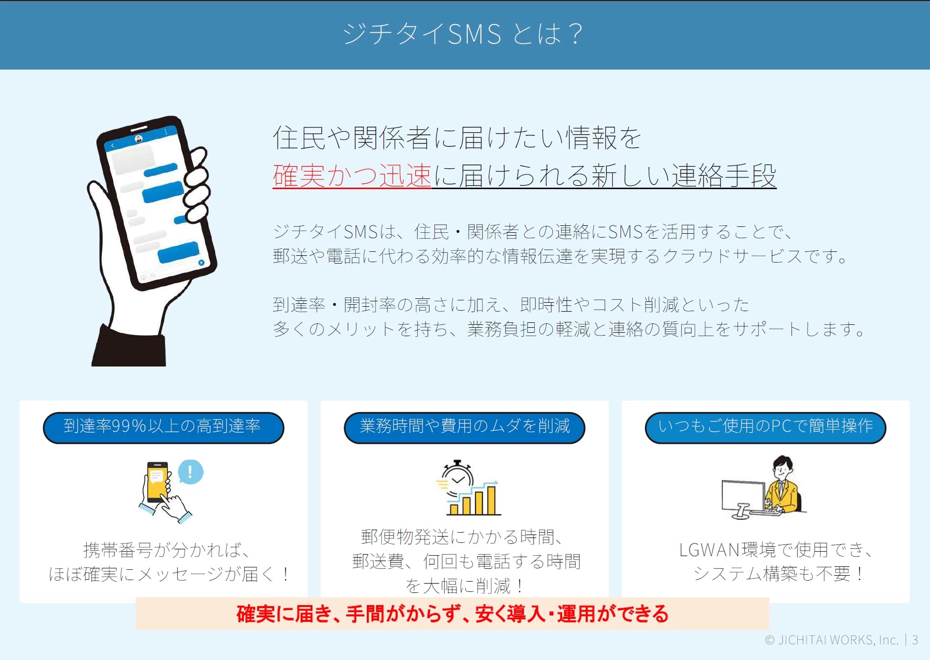 「ジチタイSMS」は240以上の自治体、47都道府県のうち46都道府県内の自治体で利用されており、非常に高い効果をあげているメッセージサービスです。ポイントは3つ。1つ目は、確実に届くということ。到達率はなんと99%以上です。2つ目は、手間がかからない・コストを抑えられるという点です。郵送や電話対応に比べ、作業時間も費用も大幅に削減できます。3つ目は、普段お使いのパソコンから簡単に操作できるということ。LGWANにも対応していますので、セキュリティ面も安心です。