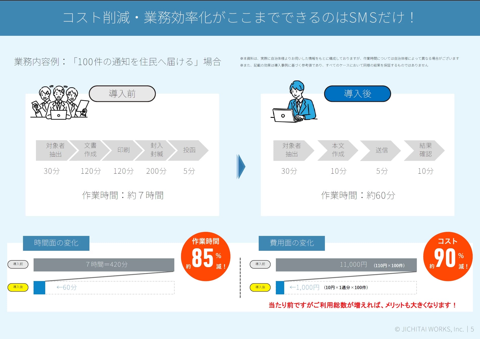 以下は、導入いただいた自治体さまにヒアリングをした内容をもとに作成した参考例です。「100件の通知を住民へ届ける」場合、これまでは全てが手作業で作業に約7時間かかっていました。ところが、SMS導入後、作業工程がぐっと減り、たったの1時間で完了するようになっています。
