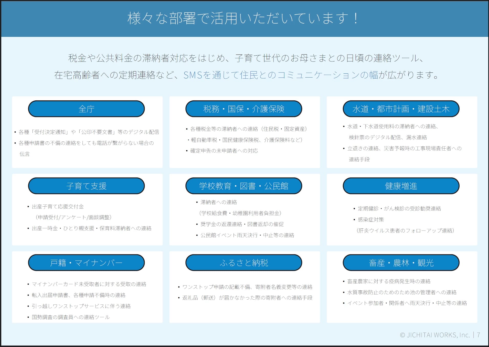 特に多いのが、郵便物や電話が多い部署。滞納者の方に何度も電話するのは大変です。しかし、SMSを使えばその手間は軽減できますし、電話や訪問、郵送でも何も反応がなかった方が、SMSならすぐに連絡を返してくれるということもよくあります。リマインド通知としても活用できるので、督促状を送った後にSMSで念押しをするという使い方もできます。