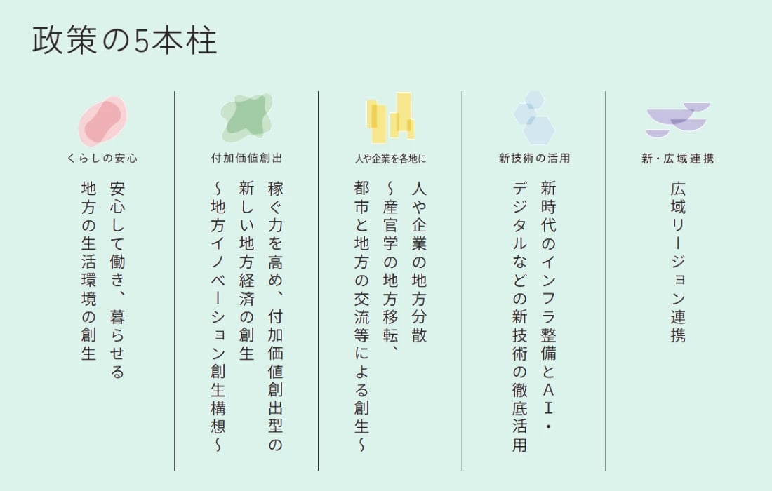 地方創生が目指す「強い経済」「豊かな生活環境」「新しい日本・楽しい日本」という3つの姿を施策として具体化するもので、次の5つになります。