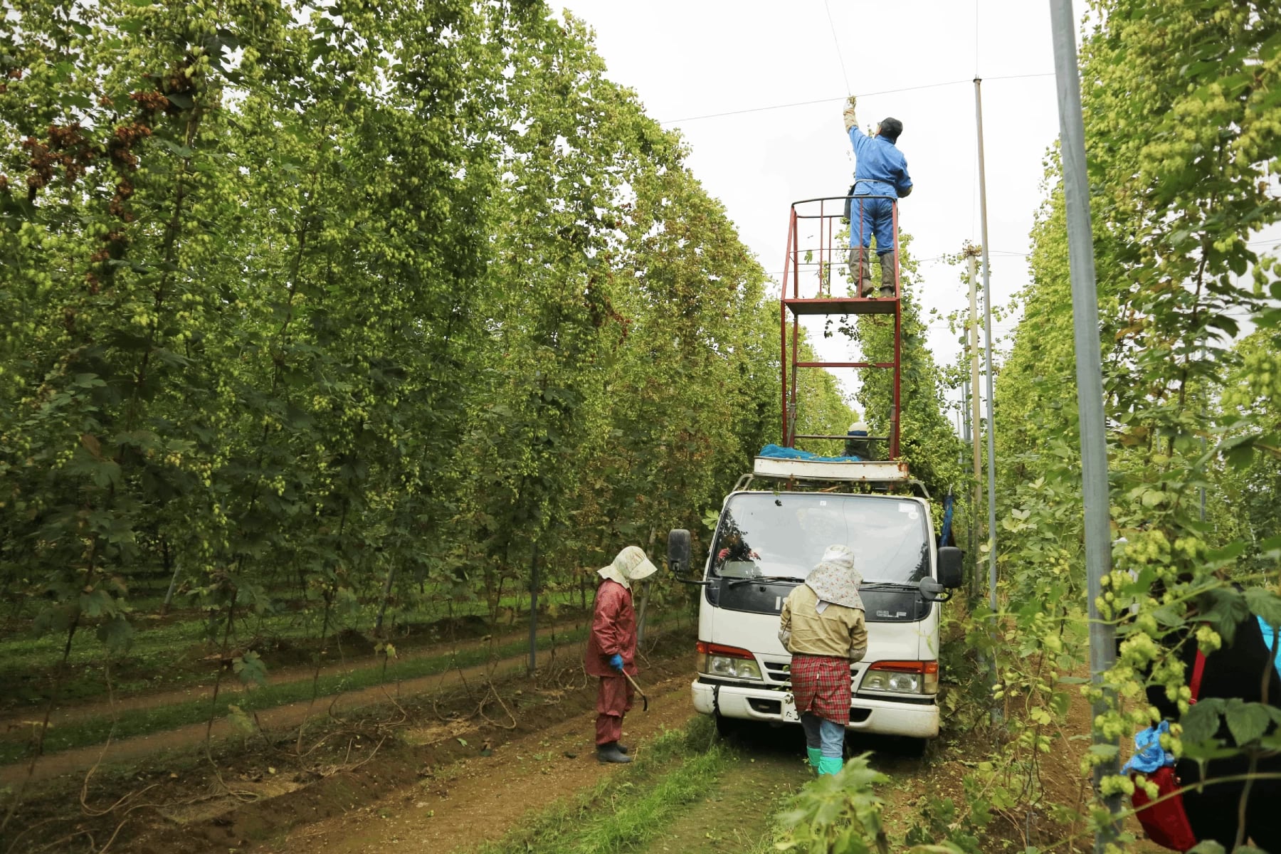 そもそもホップ栽培・収穫は重労働で、収穫時期には市内のホップ農家が総出でひとつの畑の収穫を手伝います。ほかの人の畑の収穫もホップ農家みんなで手伝っているのです。ホップの収穫は1人では難しく、トラックなどを使った高所作業が必要です。