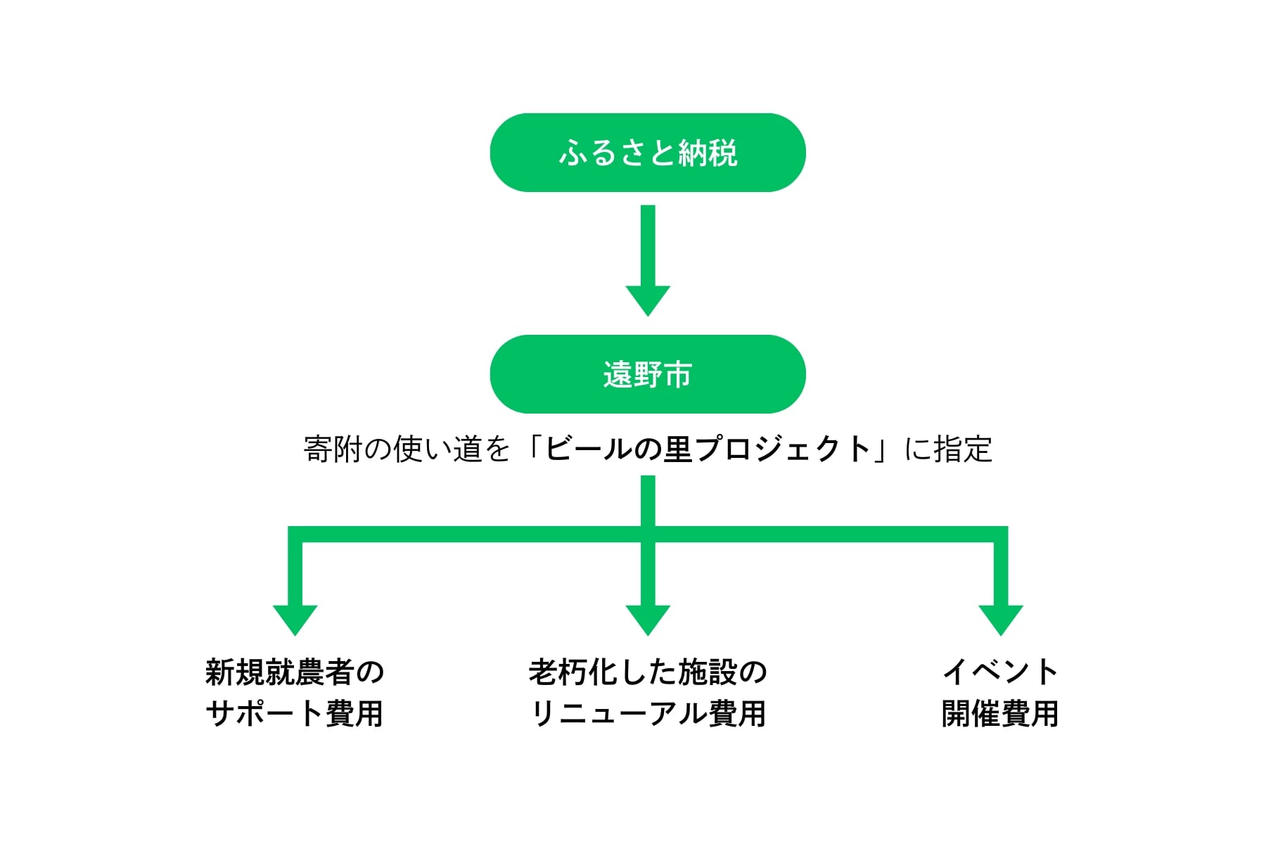 最後は、ふるさと納税を活用した寄附金募集です。ふるさと納税で自治体に寄附をすると寄附金の使い道を指定できる場合がありますが、遠野市でもこの仕組みを活用しています。遠野市にふるさと納税をする際に「ビールの里プロジェクト」を使い道として指定すると、ホップ関連の様々な取り組みに寄附金の一部が使われるようになります。