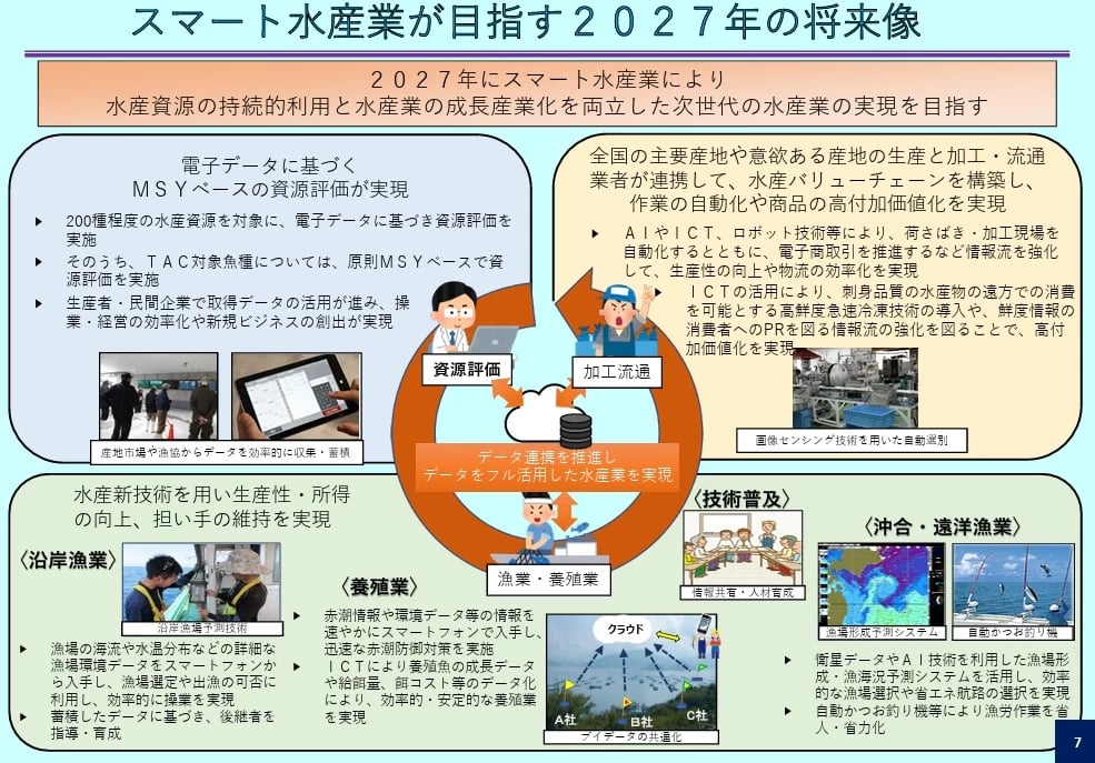 こうした状況を受け、水産庁はスマート水産業の今後の展開として、2027年を目標に、水産資源の持続的利用と水産業の成長産業化を両立する次世代の水産業の実現を掲げている。