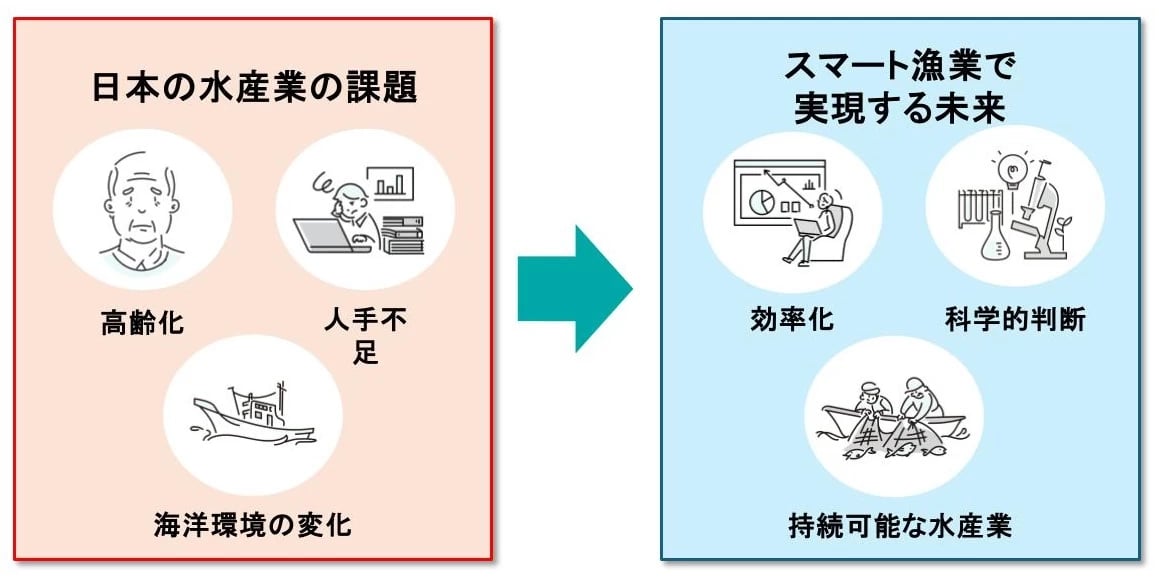日本の水産業は、後継者不足や燃油価格の高騰、気候変動による漁獲量の不安定化といった課題に直面している。こうした中、AIやIoTなどの先端技術を活用する「スマート漁業」が、一つの取り組みとして注目されている。