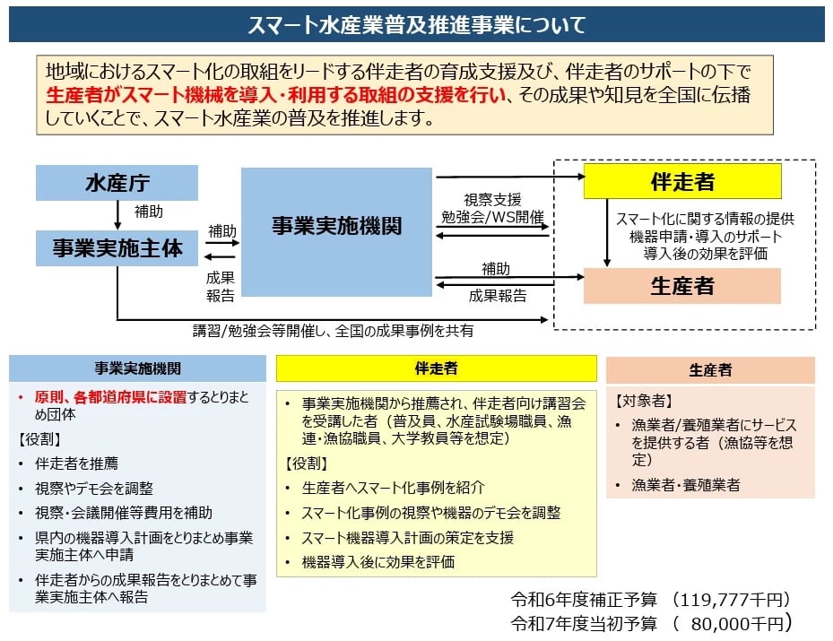 水産庁では、スマート水産業に関する技術開発や実証、現場への実装を支援するため、「スマート水産業普及推進事業」などの予算事業を実施している。実証実験や、複数の関係者が共同で利用するスマート機器の導入などが主な支援対象だ。
