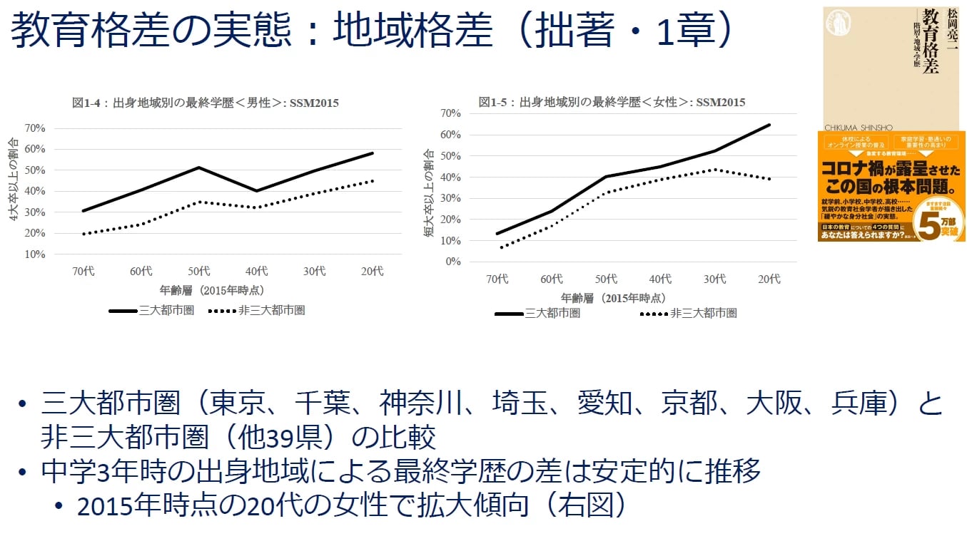 地域格差も同様で、三大都市圏とそれ以外で最終学歴に差があり、若い世代でも傾向は続いています。