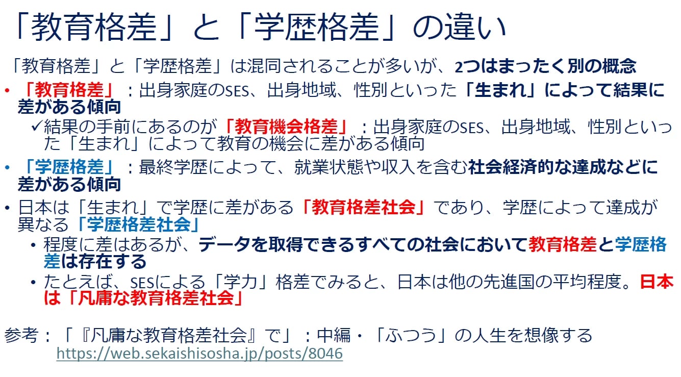 学歴によって得られる便益の差を意味する「学歴格差」とは別の概念であることを、まずは知っていただきたいと思います。