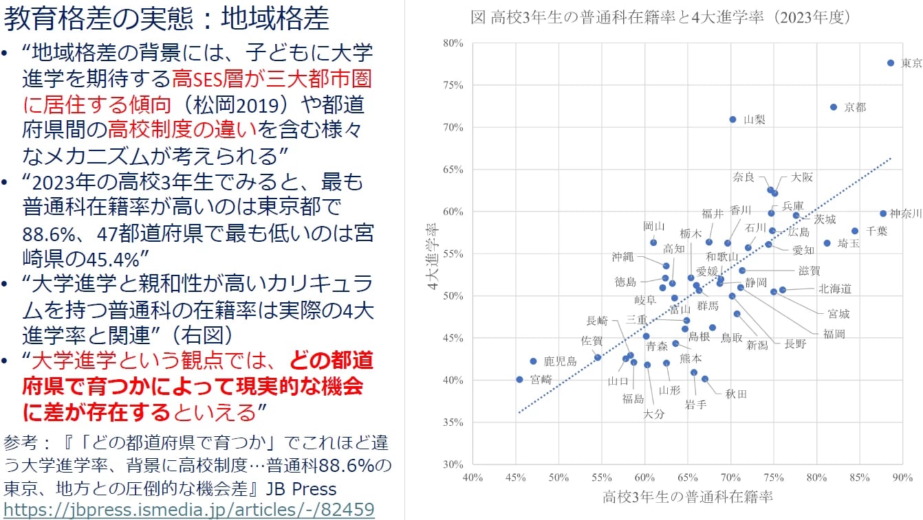 地域格差の背景には、そもそも大学進学を期待する高SES層が都市圏に住む傾向に加え、都道府県による高校制度の違いなどがあります。例えば、2023年度の高校3年生で普通科在籍率が最も高いのは東京都(88.6%)で、最も低いのは宮崎県(45.4%)です。これらの普通科在籍率は4大進学率と関連していて、どの都道府県で育つかによって現実的な進学機会に差があると言えます。
