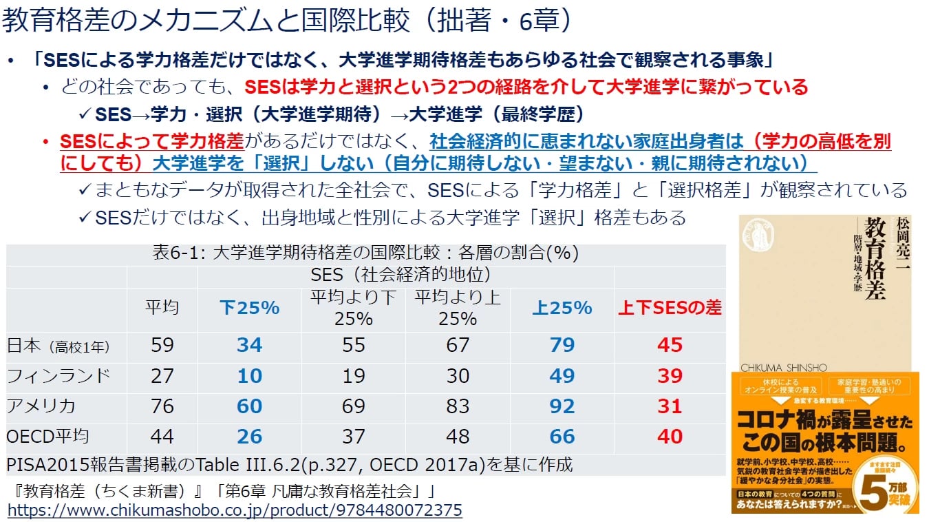 もう一つは「選択」格差。学力の高低を統計的に調整しても、社会経済的に恵まれた家庭の子は大学進学を望み、恵まれない家庭の子どもは大学進学を望まない傾向があります。この「選択」格差は他の社会でも観察されています。日本でも高校1年生の段階で大学進学を見込む割合はSESで差があり、フィンランドやアメリカなどでも同様の傾向が確認されています。