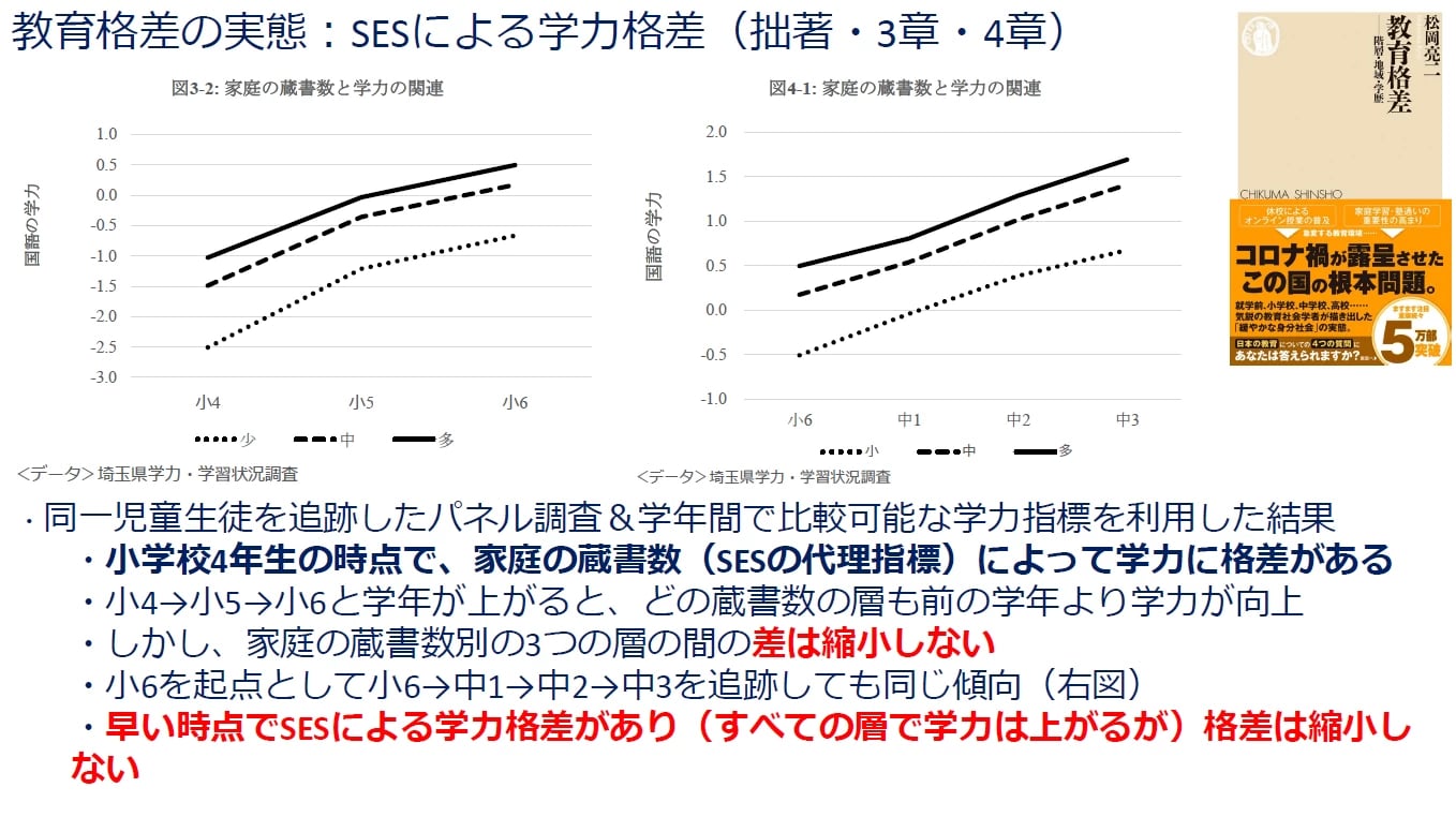 同一の児童生徒を追跡するパネル調査で、学年間で比較可能な学力指標を用いた分析によると、家庭の蔵書数(SESの代理指標)が少ない層は、小学校4年生の時点ですでに学力が低い傾向があります。また、学年が上がればどのSES層も学力自体は伸びるものの、層間の差は縮小しません。小6から中3まで追跡しても同じ傾向が続きます