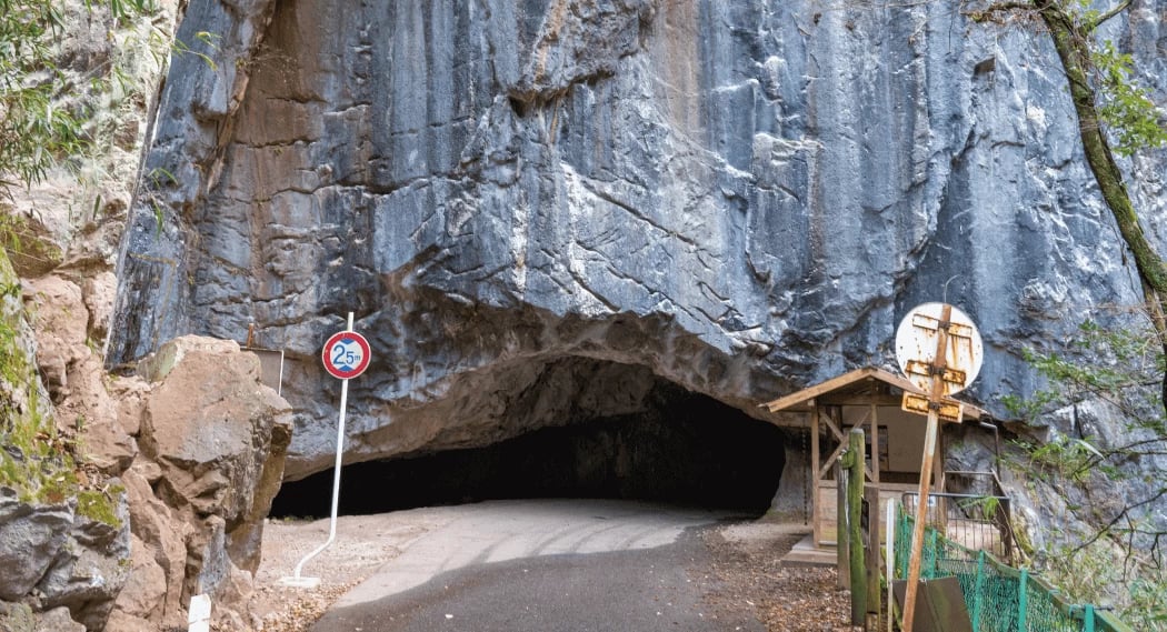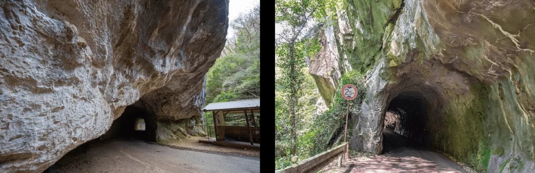 渓谷沿いを走る県道にある羽山(はやま)第二トンネルは、巨大な岩盤の裂け目に突入するような、強烈なインパクトを放つ延長32mの素掘りトンネルです。この道はもともと洞窟状で、吹屋(ふきや)地区特産のベンガラや銅を、高梁市中心部へ輸送する幹線「吹屋往来」として機能していました。近代に入り、荷車・人力車などの車両交通に対応するため、石灰岩の鍾乳洞や岩盤を人力で掘削。約2年の歳月をかけて、大正8年に現在の形となりました。