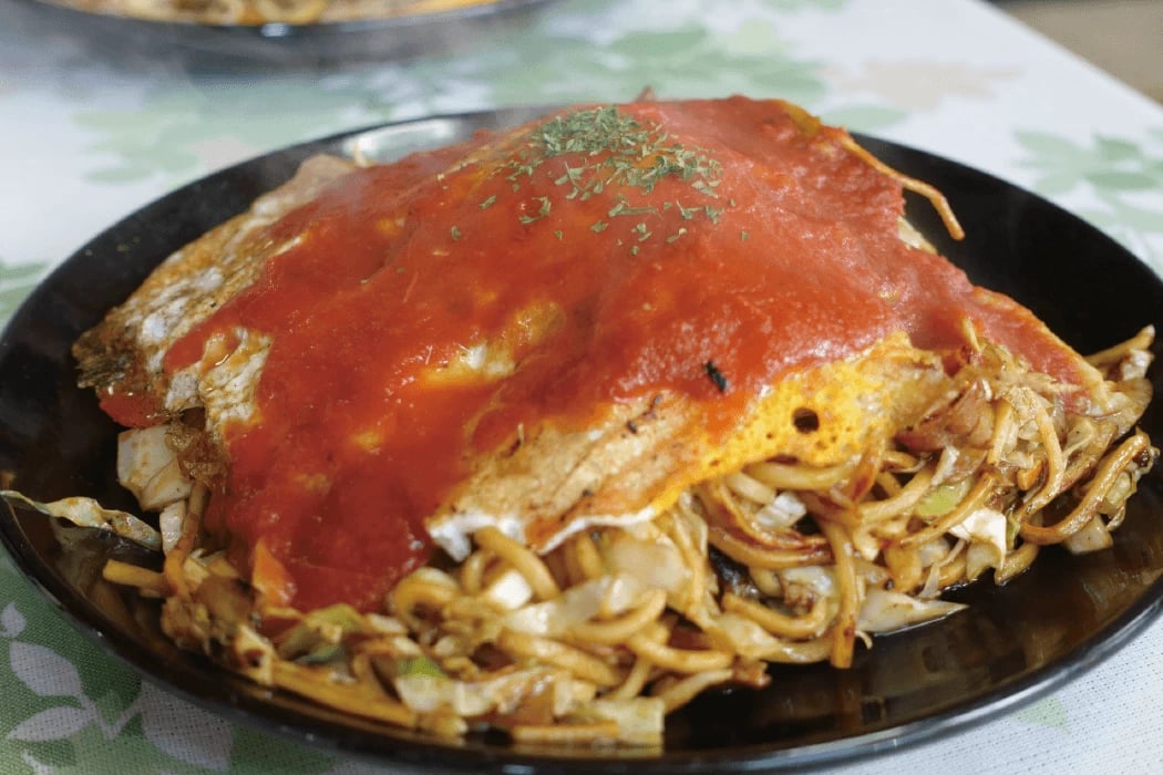 カレー味の焼きそばに特産のトマトを加えた「インディアントマト焼きそば」。