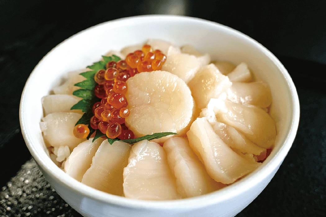 道の駅隣接の「まるごと館」で大人気のホタテ丼。新鮮なホタテがぎっしり。