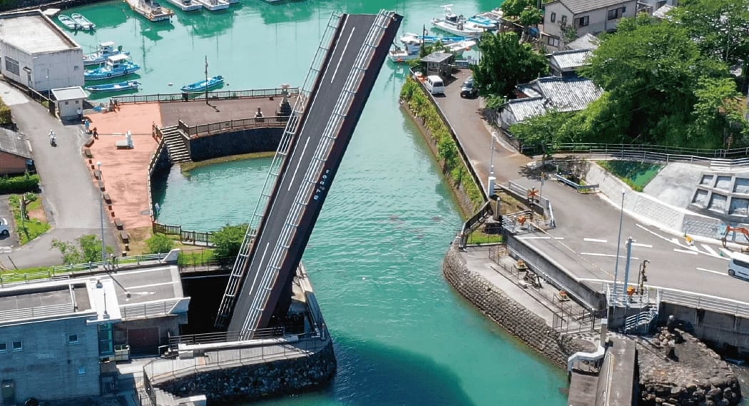 平成14年に完成した跳開式の可動橋がある手結港(ていこう)は、江戸時代に土佐藩によって建設された、日本最古の本格的な堀り込み港湾。固定橋ではなく可動橋としたのは、船舶の航路確保と安全性に加え、350年以上続く歴史的価値の高い港湾の景観維持などを、総合的に検討した結果です。