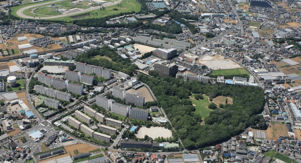 行田(ぎょうだ)地区を囲む円形道路は、旧海軍の無線基地があった名残です。基地が設置されたのは大正4年で、中央に高さ約200mの主塔、周囲に高さ60mの副塔が18本立ち並ぶ大規模なものでした。副塔を管理する道路を外縁状に設置したため、円形の珍しい景観となりました。