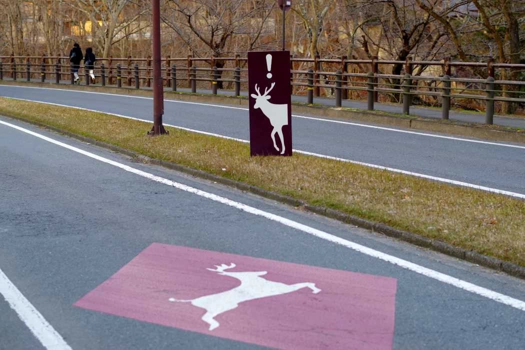 奈良県奈良市( ならし) にて。奈良公園のシカは天然記念物。野生なので、道路に飛び出してくることもあるらしい。ゆっくり走行しよう。