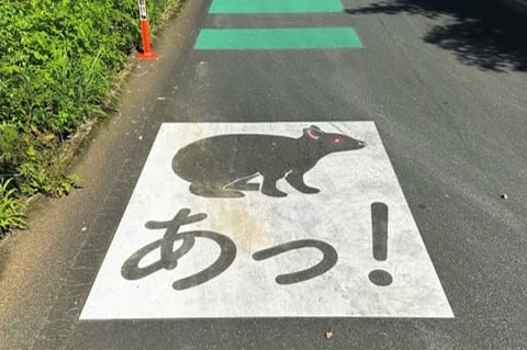 あっ!の文字と、丸っこいアマミノクロウサギのシルエットがかわいい。よく見ると目や耳が赤い。鹿児島県徳之島町(とくのしまちょう) にて。