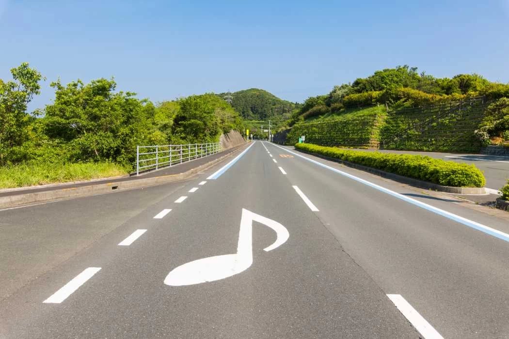 道路に音符マーク♪なんだかウキウキしてしまう。この先にある佐田(さだ) 岬メロディー道路の案内標示。愛媛県伊方町(いかたちょう)にて。