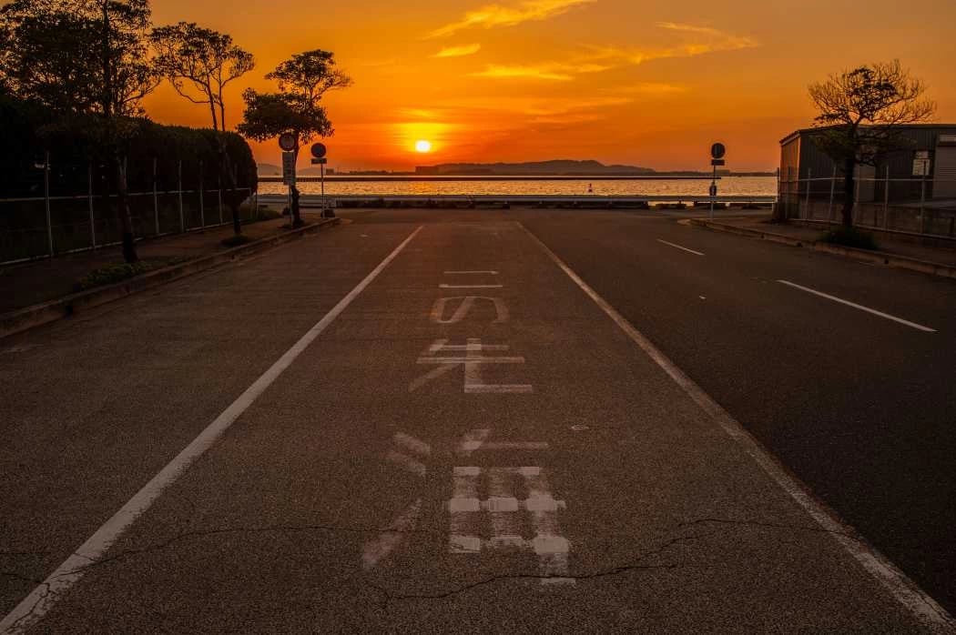 福岡県福岡市(ふくおかし) のふ頭にある「この先海」のメッセージと夕日のコラボ。景色に見とれて海に落ちないよう、気をつけたい。