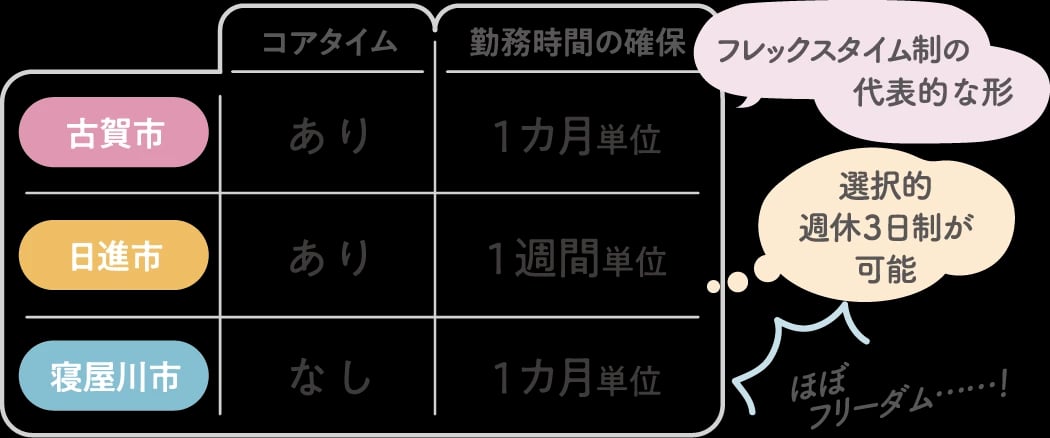 ひと口にフレックスタイム制といっても、コアタイムの有無や勤務時間の確保範囲で違いがある。どの方法が合うかは、自治体のデジタル活用度や職員数などで異なるようだ。